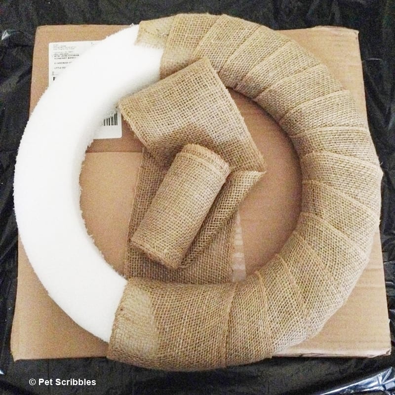 Step Three: Wrap the entire Styrofoam wreath form with the wide burlap ribbon. I wrap on an angle with a slight overlap of the previous band of ribbon.