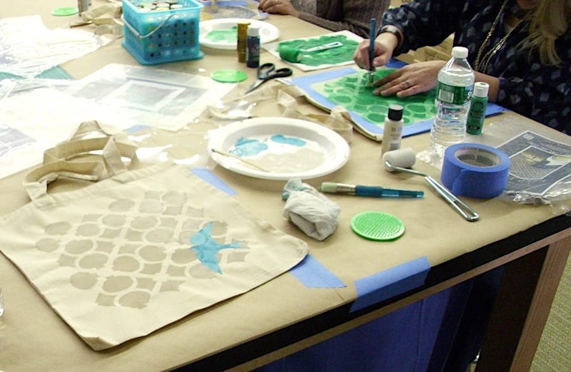 (Check out those fat stencil brushes in the photo above!) As you saw in my previous post, Cutting Edge Stencils set up a large worktable where each of us had a blank canvas tote bag, and to the right of it: a stencil brush, a paper plate, a few paper towels, and two sheets of copy paper.