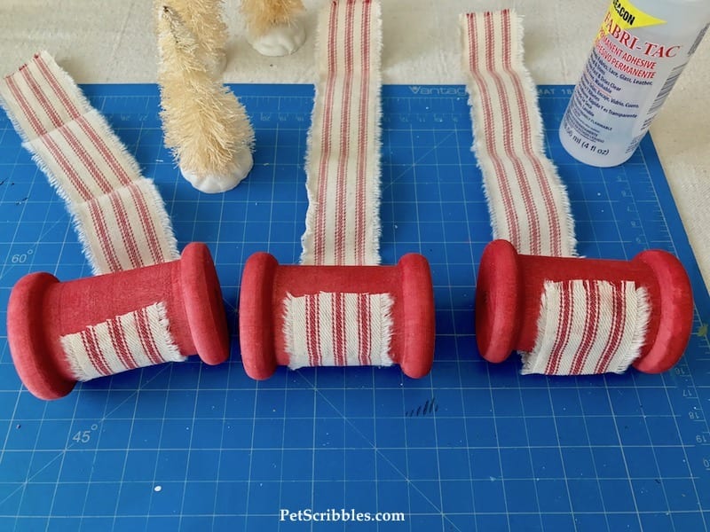 Using Fabri-Tac adhesive, I attached one end of the ticking to each spool, as shown below.