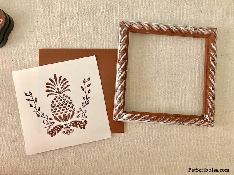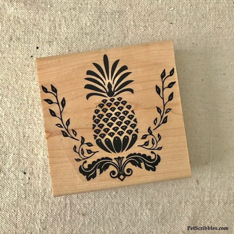 Pro tip: Simply Stamps offers their stamps in multiple sizes. Purchase a larger size — like I did for this farmhouse pineapple art — for artwork or perhaps to use on a table runner. Purchase smaller stamps in the same design to use for matching decor, such as smaller framed art or cloth napkins.